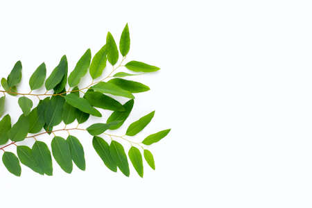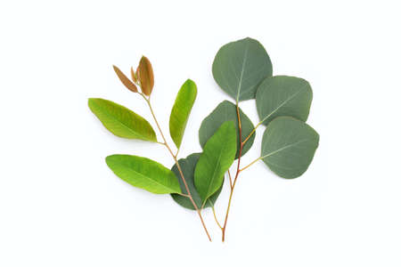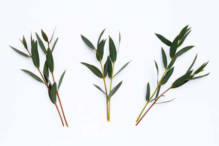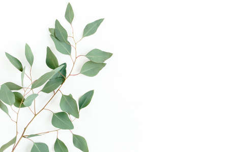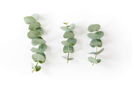 Green branch, leaves eucalyptus isolated on white background. Flat lay, top view minimal concept.
