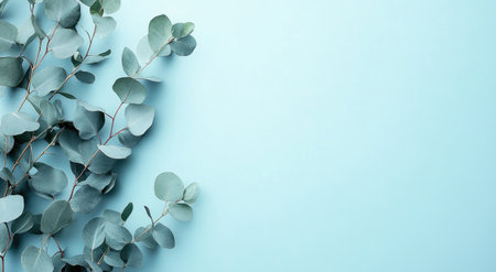 Minimalist light blue background with soft eucalyptus leaves on the left side, creating an elegant and clean composition for text or product display. --ar 78:43 --v 6.1 Job ID: 10a1c880-2bae-4670-8e84-8b1ee67c52c4
