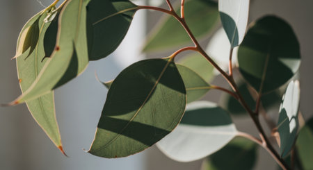 This photo showcases delicate eucalyptus leaves in soft natural light, ideal for emphasizing serene spaces and enhancing aesthetic designs in various art forms.