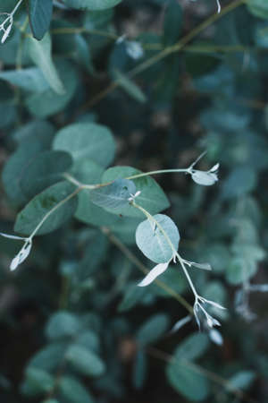 Eucalyptus blue leaves live growing bush in garden. Abstract eucalyptus background copy space