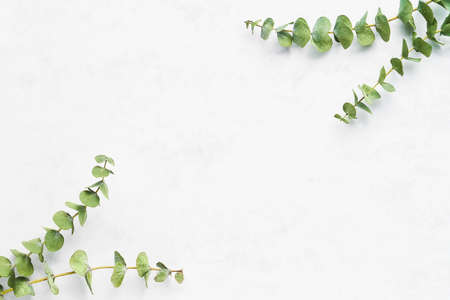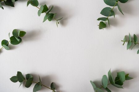 Eucalyptus leaves on marble background. Frame made of eucalyptus branches. Flat lay, top view