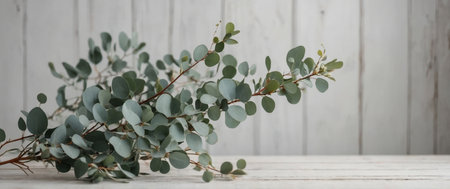 AI Generated. Eucalyptus branches leaves on white wooden table