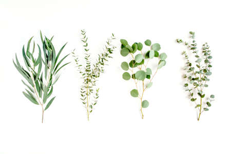 Mix of herbs green branches, leaves eucalyptus and plants collection on white background. flat lay, top view