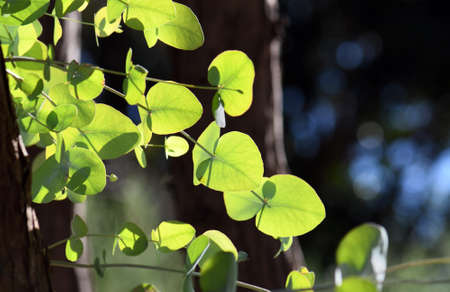 Backlit young ovate leaves of the Australian native Silver Dollar gum tree, Eucalyptus cinerea, family Myrtaceae. Also known as the Argyle Apple. Endemic to New South Wales