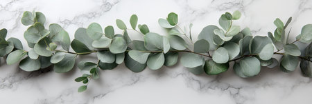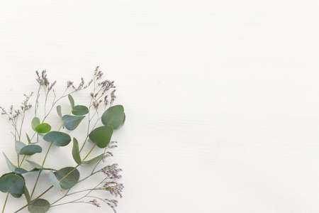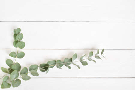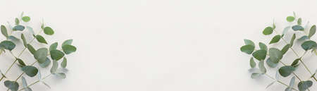 Top view image of eucalyptus composition on white wooden background .Flat lay. banner