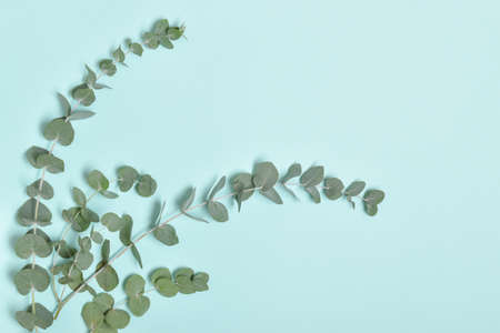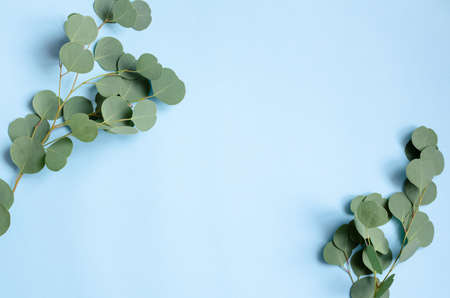 Eucalyptus branches on a blue banner background. Fresh eucalyptus leaves as a base for cosmetics based on natural oils and fragrances.