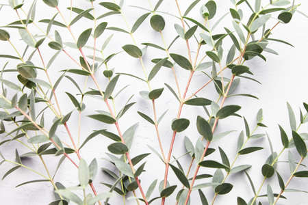 Green eucalyptus branches on a white background. Flat lay, top view.
