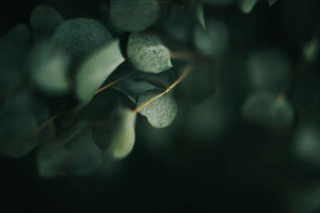 Branch of eucalyptus on dark green background, gloomy photo of the plant