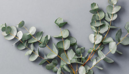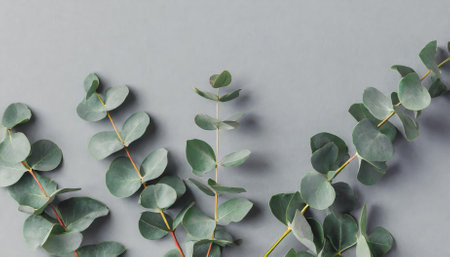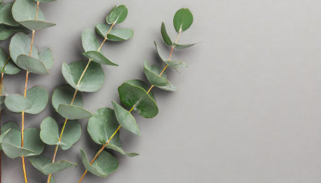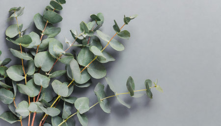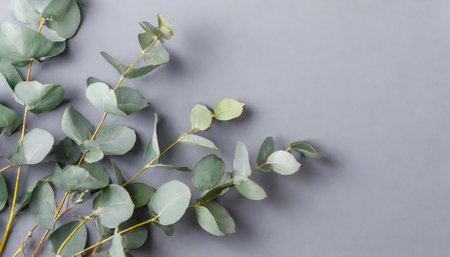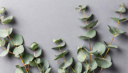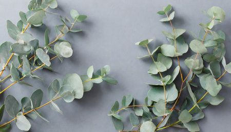 Elegant eucalyptus branches elegantly laid on a muted pastel gray background in a minimalist top-view composition, perfect as a nature-inspired mockup or design template with space for text.
