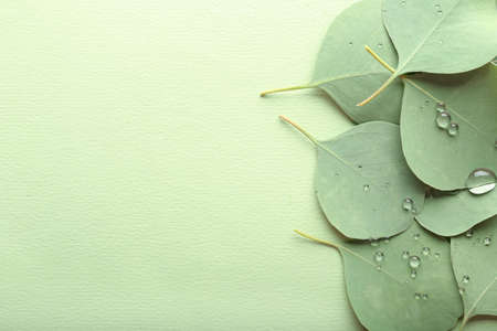 Natural eucalyptus leaves with water drops on mint pastel green background. A branch of eucalyptus, drops of water on the leaves. Spring background. Flat lay floral composition, top view, copy space.
