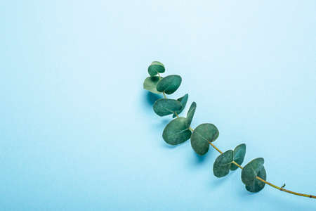 green branch of eucalyptus against blue background. Top view, flat lay.