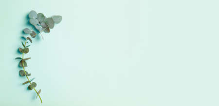 Banner with a branch of eucalyptus on a white background. Minimalism. Background for Eco-cosmetics. Flat layout, top view, place to copy.