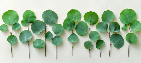 Eucalyptus Sprigs Arranged Vertically, Top View on Beige Background, Minimalist Style