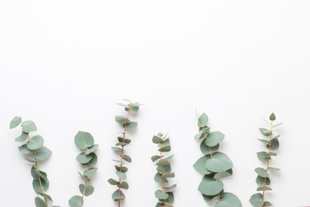 Eucalyptus branches on a white background. SPA concept. Flat lay, copy space for text