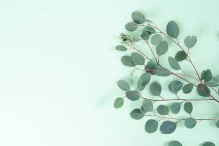 wedding or mothers day backgroundgreen eucaliptus leaves over mint green background with copy space