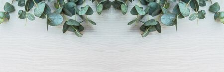 Fresh eucalyptus leaves and twigs. Panoramic banner image. Flat lay on off white marble table.