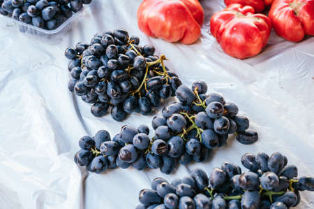 Closeup of a hand with blue ripe grapes. Fresh blue bunches of grapes. The concept of winemaking, wine, vegetable garden, cottage, harvest