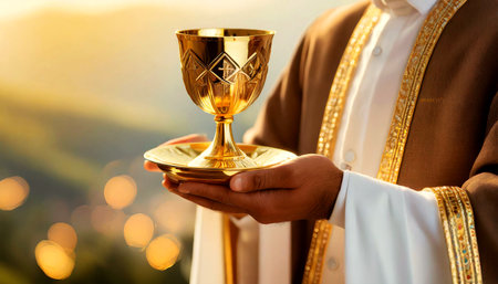 Extreme close-up of the hands of a priest holding a golden chalice, cup of wine (blood of Christ), symbolizing the holy sacrament of Communion in Christianity and the connection with God. Generative Ai