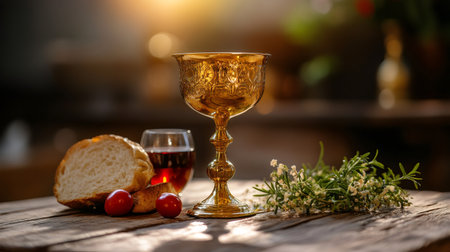 A golden cup and a piece of bread are placed on a table. The cup is filled with liquid, and the bread is placed next to it. Concept of celebration or a special occasion, as the cup