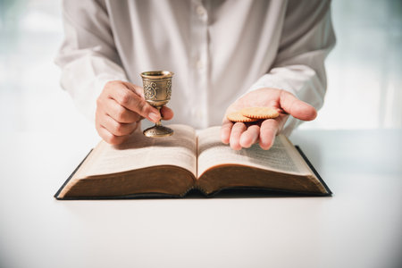 Man holding bread and wine in Hoy Communion or Eucharist. Holy bible on table at the background.