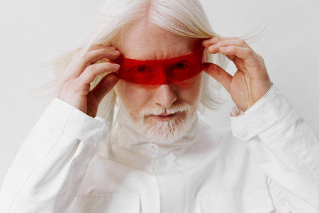 futuristic fashion, portrait, trendy eyewear, white background, dramatic lighting, contemporary style, model with long hair, vibrant red glasses, clean lines, artistic expression