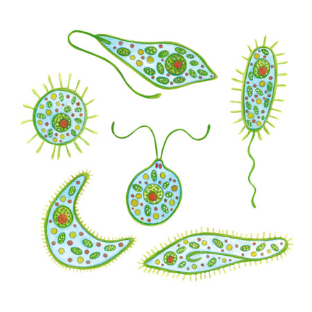 Euglena green, zooplankton, animal, unicellular organism. Watercolor illustration drawn, cartoon, hand-made. For stickers, biology and ecology manuals. Sea, animal, organism, ocean