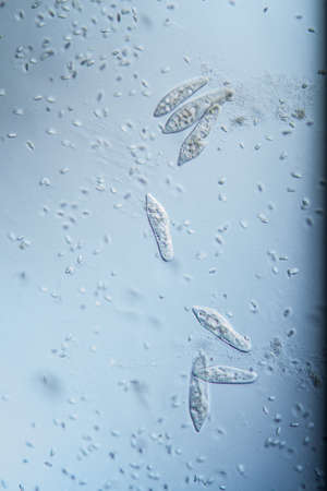 Paramecium caudatum is a genus of unicellular ciliated protozoan and Bacterium under the microscope.