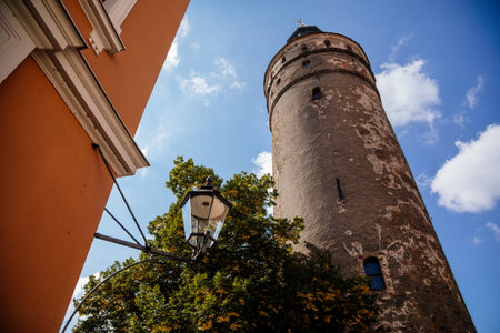 Goerlitz, Saxony, Germany, 04 September 2021: gothic renaissance massive Nikolaiturm or Nikolai Tower, historical center of old town, part of medieval fortification, narrow street at sunny summer day