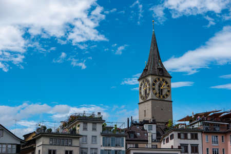 Old medieval church towers in Zurich city Switzerland summer day white clouds 2020