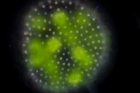 Spherical colony of freshwater green algae (Volvox). Microscopic view, Rheinberg illumination.