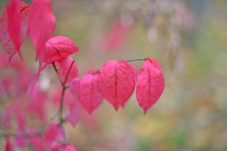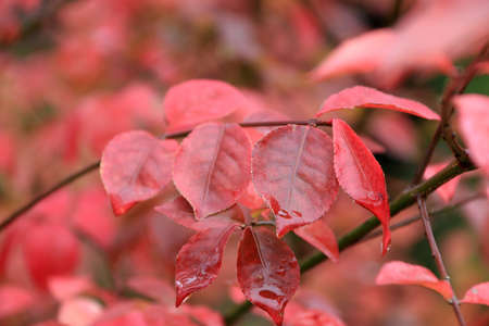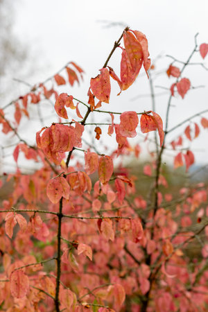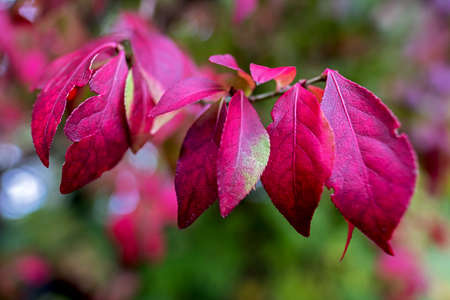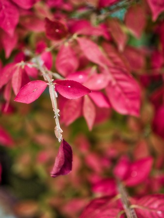 Bright red foliage of an ornamental euonymus shrub in autumn. Selective focus on one branch with leaves.