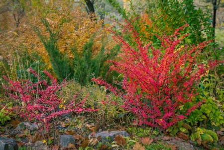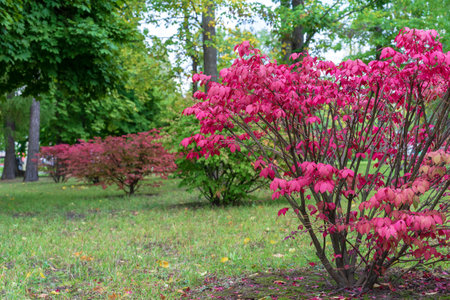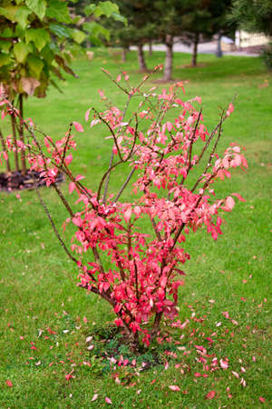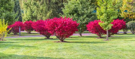 A fragment of the autumn park - panorama. Winged euonymus Compactus is a perennial shrub that impresses with its beauty.