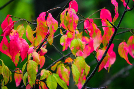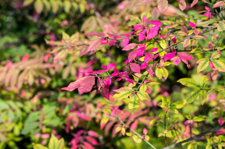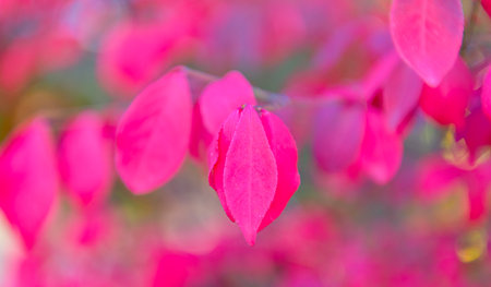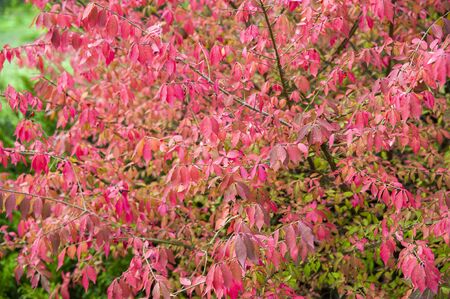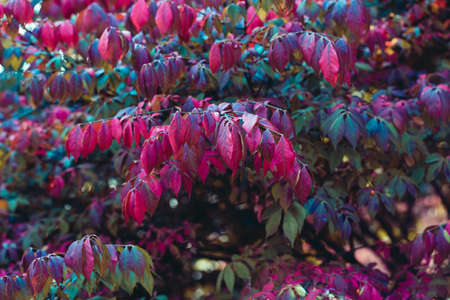 Autumn pink bush in forest , colorful background of stunning Euonymus alatus, winged spindle, or burning bush popular ornamental shrub plant tree with attractive fall hot pink purple leaves in autumn