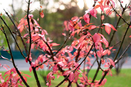 Red leaves on the branches of a bush in the autumn garden.