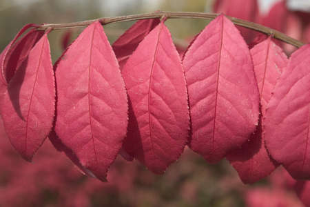 A close up of the pretty leaves of the spindle tree, on a sunny autumn day
