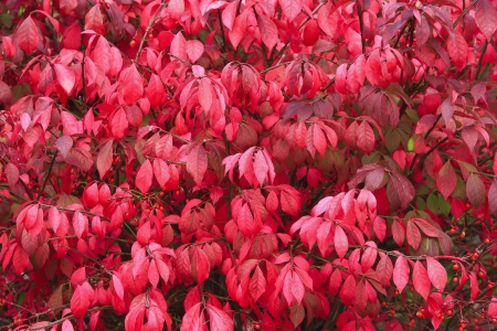 This large red burning bush is aflame in its glory with bright red autumn foliage.