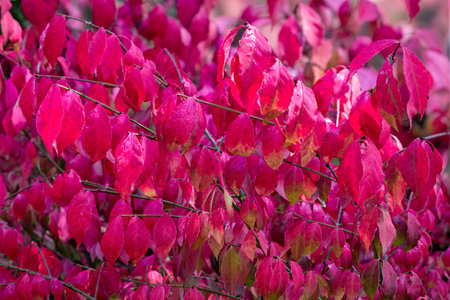 Bright red autumn leaves of ornamental shrub Euonymus alatus Compactus