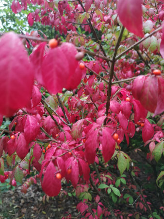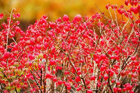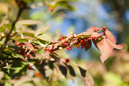 branch of Euonymus tree with ripe berries close up in city park on sunny autumn day (focus on berries on foreground)