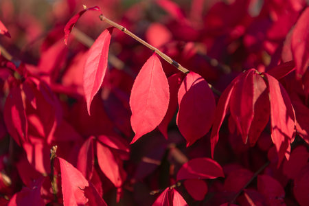 Macro shot of burning bush plant (Euonymus Alatus) with it's vibrant red leaves in the fall.