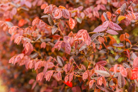 Close up bush with bright red leaves in a city park. Focused foliage.