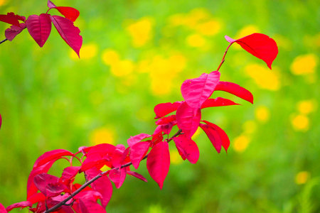 Red leaves in the garden with yellow flower background, selective focus.