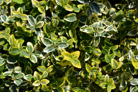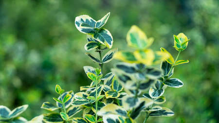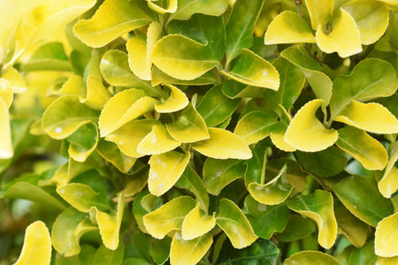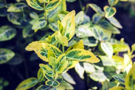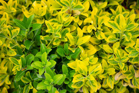 Euonymus plant with green, blue and yellow leaves texture background, plants in a garden