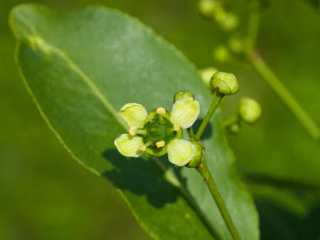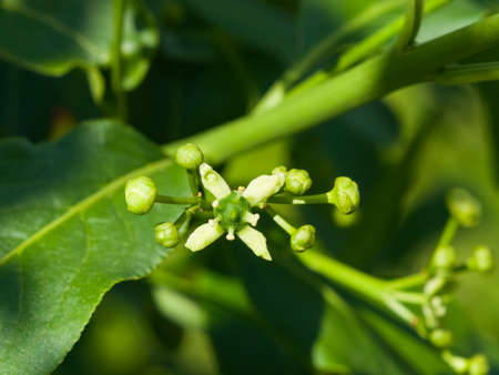 Small flower and buds on European or Common Spindle Tree, Euonymus Europaeus, macro, selective focus, shallow DOF.