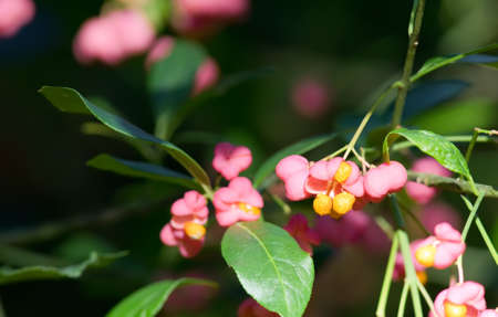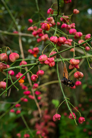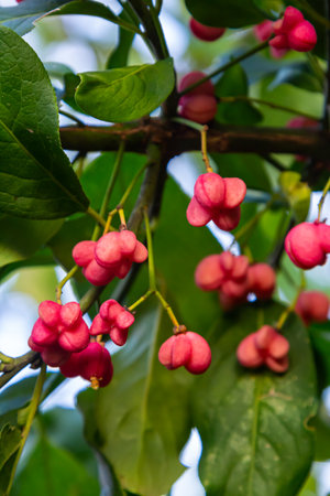 Beautiful spindle plant, Latin name Euonymus europaeus in the wild, picture tasks in Belgium