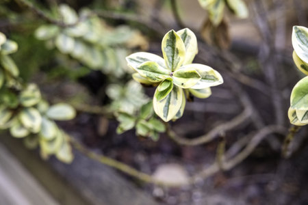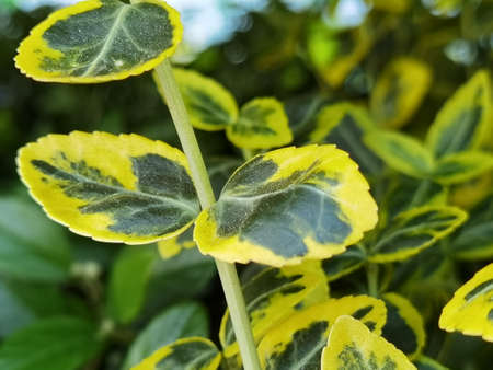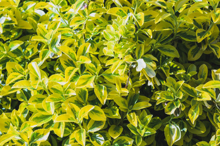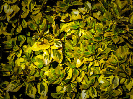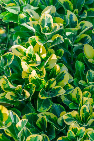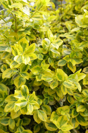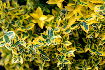 Vibrant Variegated Yellow and Green color euonymus bush Leaves Close-Up.