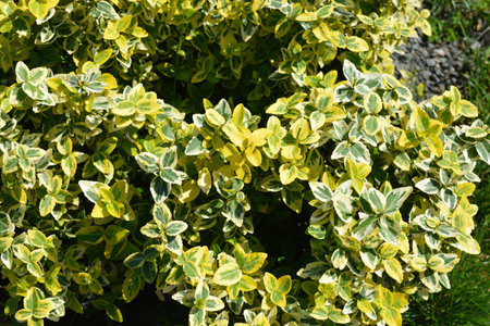 Euonymus fortunei Emerald Gold in garden, variegated foliage