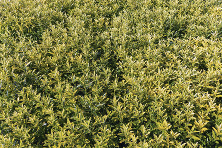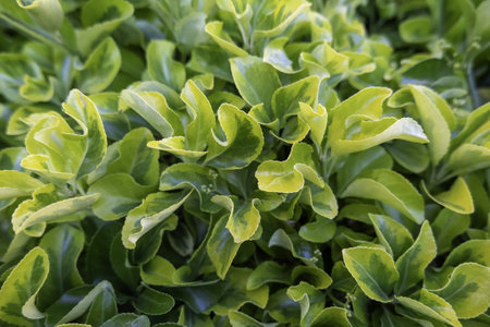 The bright green leaves of evergreen plant Japanese spindle or Euonymus japonicus shrub. The concept of landscape travel and scenic destinations.
