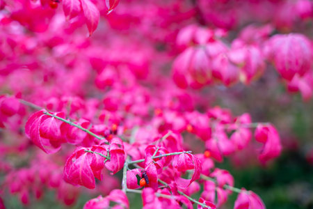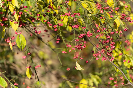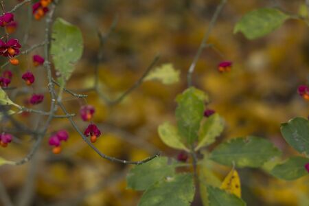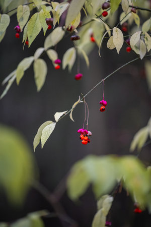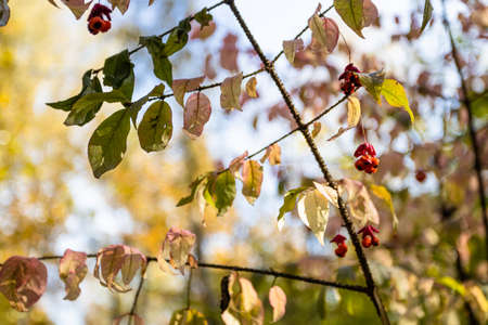 branch of Euonymus tree with ripe berries close up in city park on sunny autumn day (focus on berries on foreground)