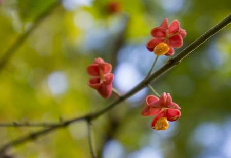Small flower on European or Common Spindle Tree, Euonymus Europaeus, macro, selective focus, shallow DOF.