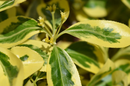 Japanes spindle Bravo leaves and small flowers - Latin name - Euonymus japonicus Bravo